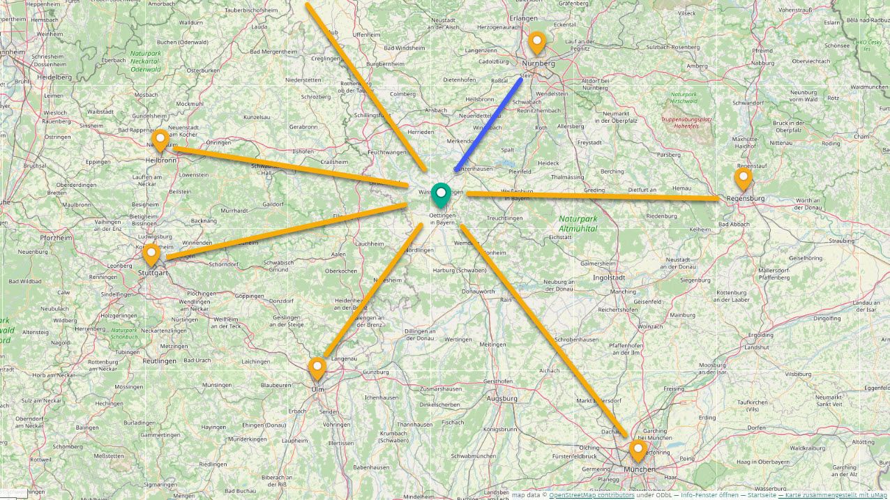 Die direkte Route führt in der Regel über die B2 Richtung Weißenburg / Treuchtlingen, anschließend weiter über die B466 Richtung Wassertrüdingen und schließlich nach Oettingen. Die Strecke ist durchgehend gut befahrbar und ohne Großstadtverkehr entspannt nutzbar.